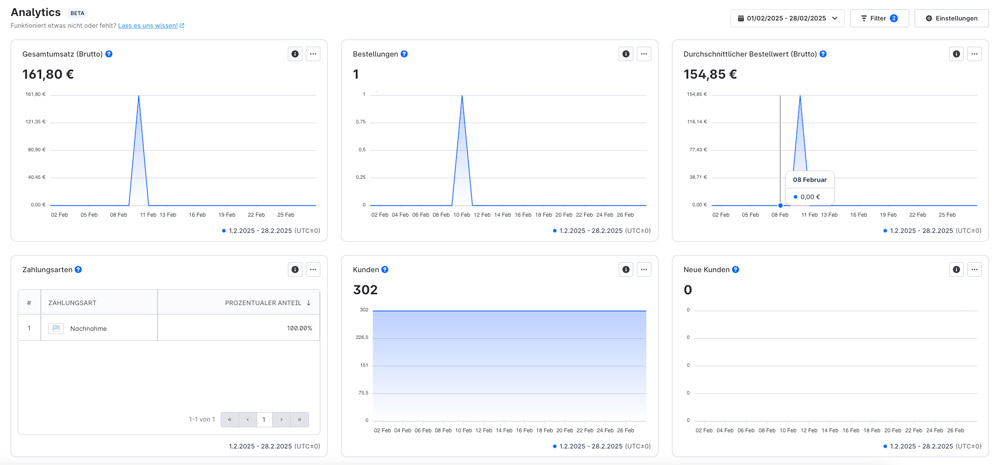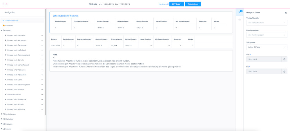 Die Auswertungen können nach Zeitraum, Verkaufskanal, Land, Kundengruppe, Bestell-/Liefer-/Zahlungsstatus gefiltert werden.