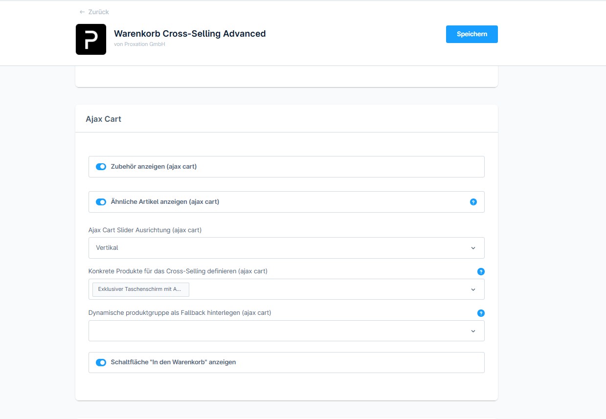 In der Konfiguration können folgende Einstellungen vorgenommen werden: Zubehör im Ajax Cart anzeigen, ähnliche Artikel im Ajax Cart anzeigen, konkrete Produkte oder Produktgruppen im Ajax Cart anzeigen und Fallback für den Ajax Cart hinzufügen. Dieselben Einstellungen sind auch für den Checkout und den normalen Warenkorb möglich.